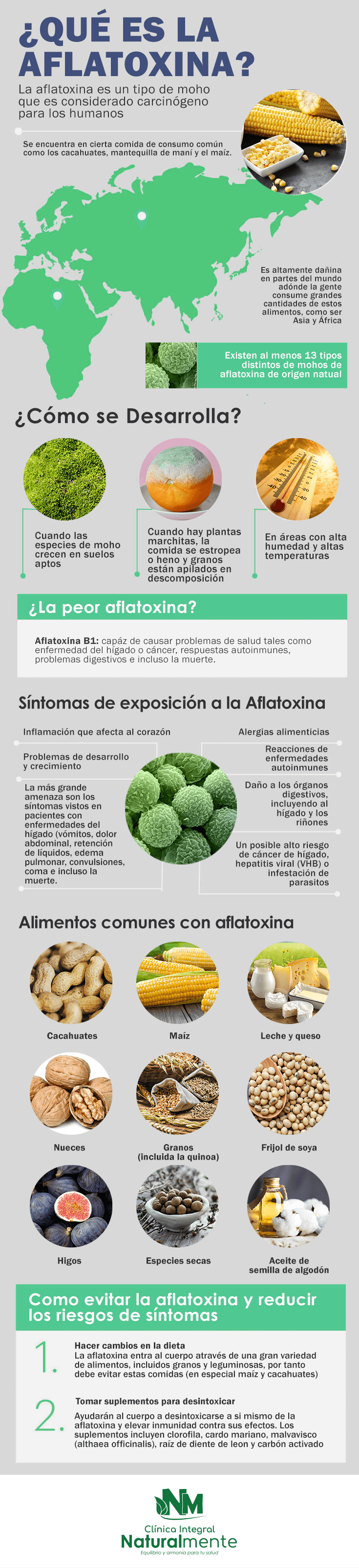 La aflatoxina es un de moho que se considera un carcinógeno humano. Se encuentra en ciertos alimentos comunes como, cacahuates, mantequilla de maní y maíz.